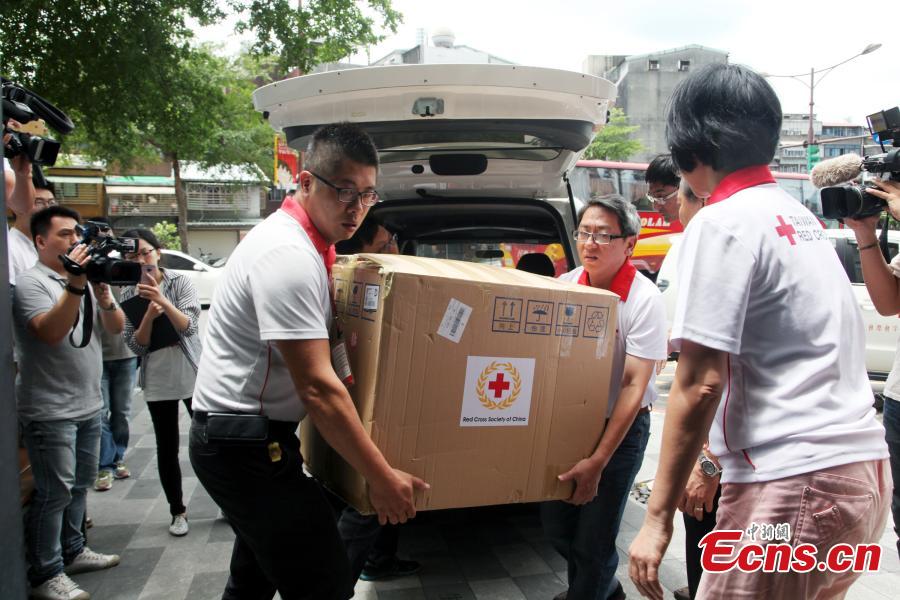 Medical supplies donated by the mainland’s Red Cross Society arrive in Taipei, Taiwan, July 8, 2015. The supplies will be distributed to 13 hospitals where people injured by a blaze at a water park party are receiving treatment. (Photo: China News Service/Huang Shaohua)