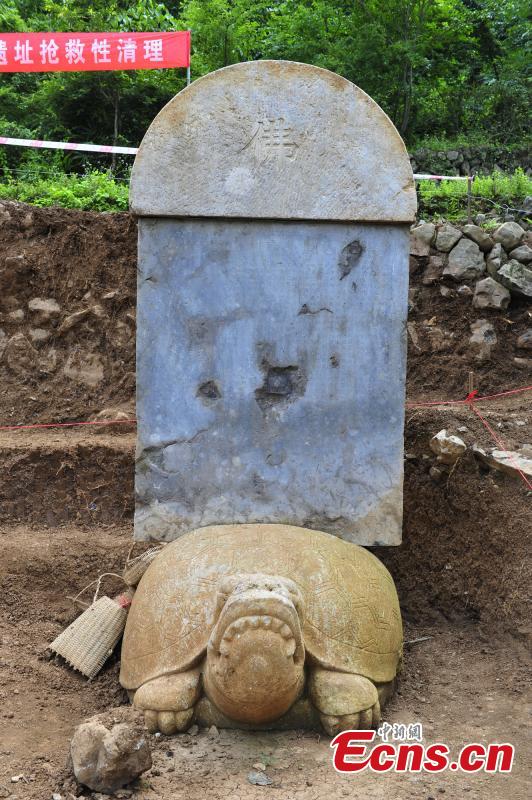 | A relic of the Ming Dynasty (1368-1644) is found at a village in Yuan’an county, Central China’s Hubei province, July 10, 2015. A stone tortoise was found first when construction work was taking place, and archeological workers later discovered a Buddhist pagoda. (Photo: China News Service/Wang Kangming) |