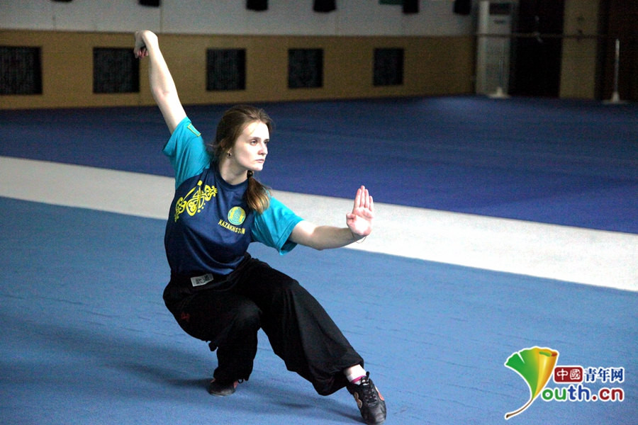 Renia does daily exercises in the Wushu hall. (youth.cn/Guo Wenjing)