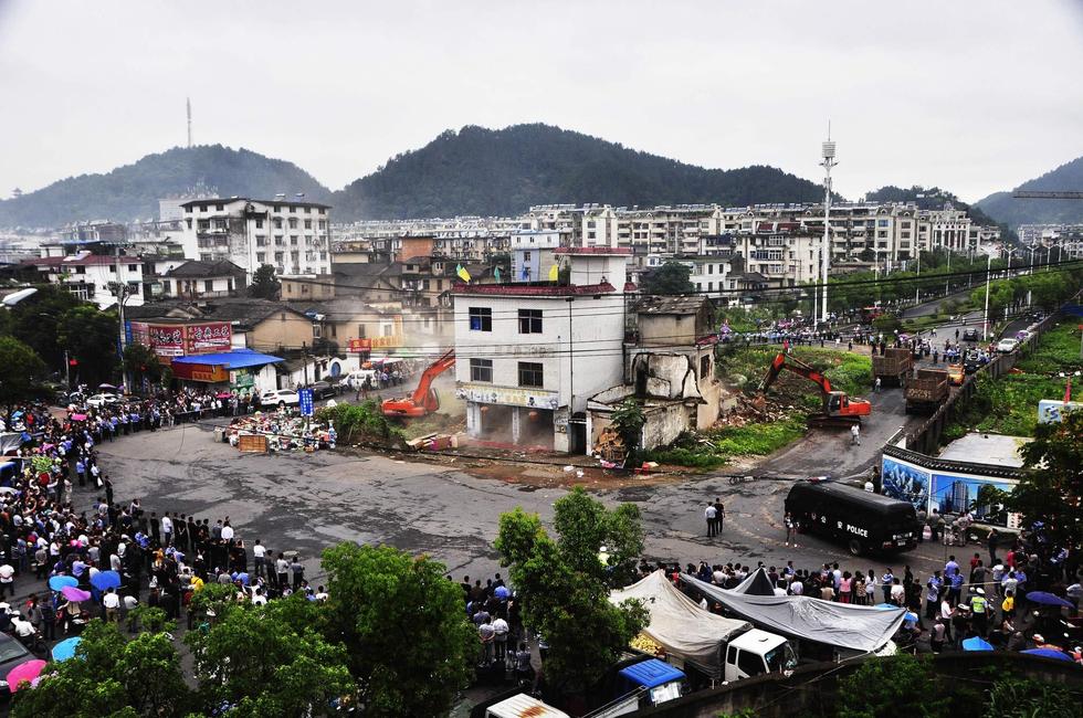 A house located at the intersection of two roads in Huangshan city, Anhui province, was forcefully demolished on Wednesday. The demolition took place in the presence of 300 police. The officers were used to blockade the road.