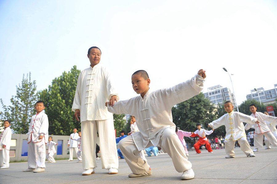 A boy practices Tai chi under instruction of a trainer on People’s Square of Gu’an, Hebei province on July 10. Tai chi is one of the most popular fitness exercises among Chinese people. (Xinhua/ Lu Peng)