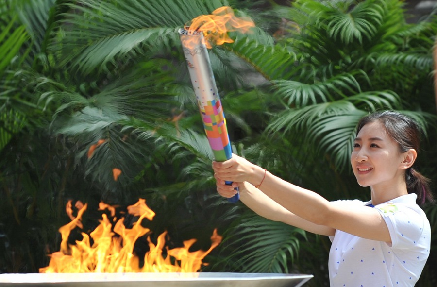 | Olympic champion He Wenna lights the torch for China’s first Youth Games on July 10, 2015. The National Youth Games will be held in Fuzhou, Fujian Province on Oct. 18, 2015. (Xinhua/ Lin Shanchuan) |
