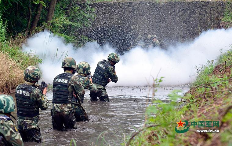 54 special operations soldiers from Jiangsu armed police corps attend a field comprehensive drill in Nanjing on July 8, 2015. They successfully completed a series of training subjects, such as 10 km long-range raid, rock climbing, rope descending and wading. (Photo/www.81.cn)