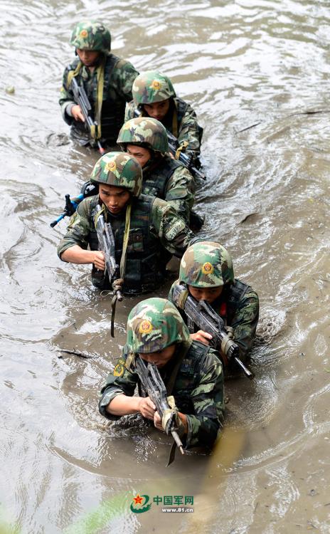 | 54 special operations soldiers from Jiangsu armed police corps attend a field comprehensive drill in Nanjing on July 8, 2015. They successfully completed a series of training subjects, such as 10 km long-range raid, rock climbing, rope descending and wading. (Photo/www.81.cn) |
