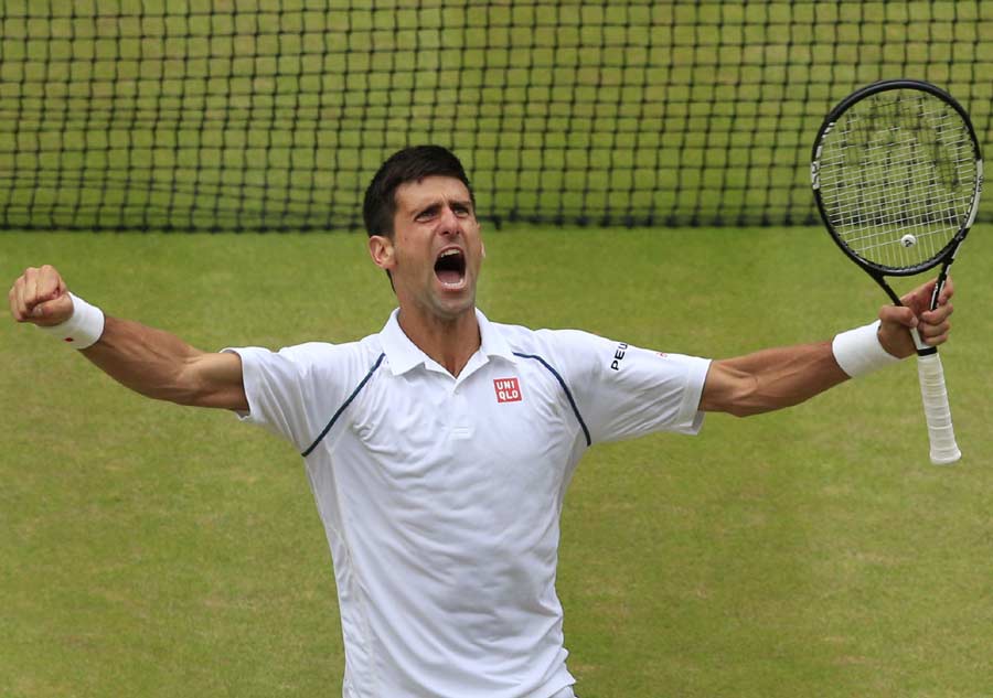 Novak Djokovic of Serbia celebrates after winning his Men's Singles Final match against Roger Federer of Switzerland at the Wimbledon Tennis Championships in London, July 12, 2015. [Photo/Agencies]