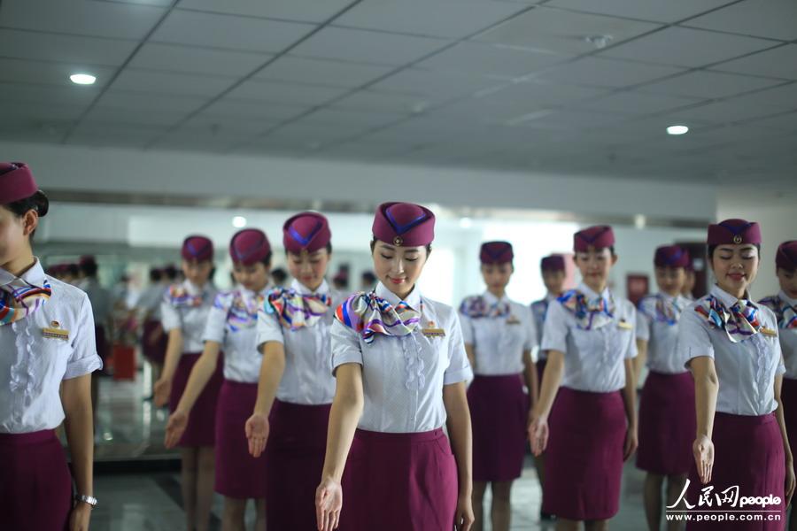 A group of stewardesses in Chongqing passenger service section of Chengdu Railway Bureau are in training on July 8, 2015. (Photo/people.cn)