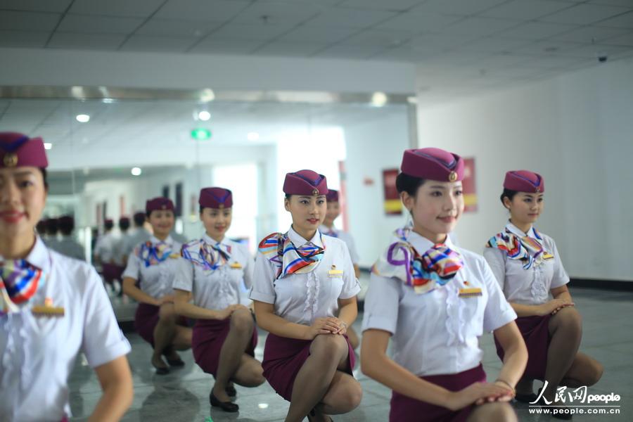 A group of stewardesses in Chongqing passenger service section of Chengdu Railway Bureau are in training on July 8, 2015. (Photo/people.cn)