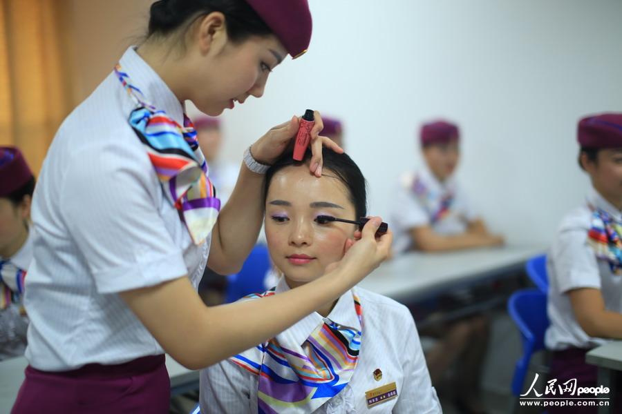 A group of stewardesses in Chongqing passenger service section of Chengdu Railway Bureau are in training on July 8, 2015. (Photo/people.cn)