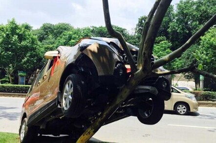 A greedhand driver drives his new car up a tree outside a 4S shop where he has just brought the car in Nanjing, east China’s Jiangsu province on July 12, 2015. The driver got his driving license a month ago. Fortunately, nobody was hurt. (Photo from Weibo)