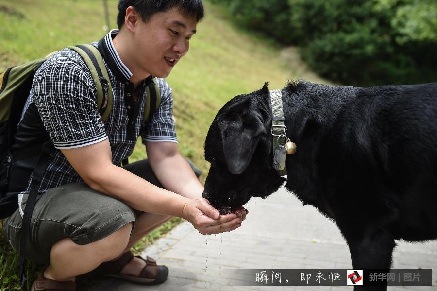 Wu Lei feeds Mixiu with water, July 10, 2015. (Xinhua/Ou Dongqu)