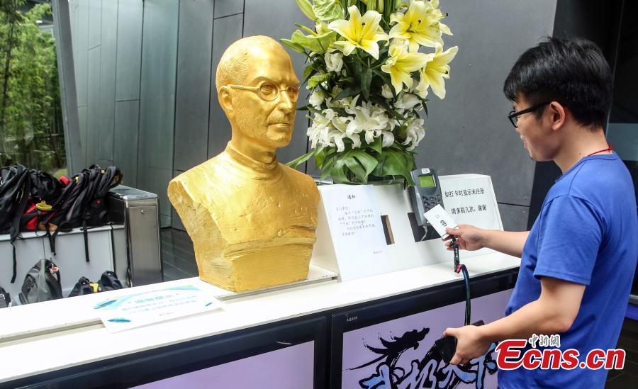 A statue of the late Apple cofounder Steve Jobs is seen at a technology company in Shanghai. The company put the gold-plated statue at the entrance to inspire its employees to learn from the former Apple CEO. (Photo: China News Service/Yu Qing)