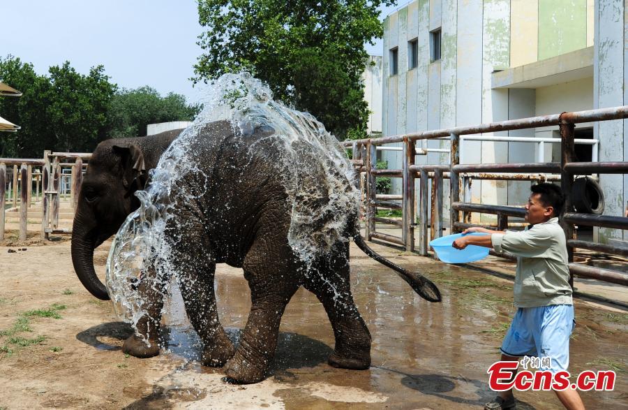 A zoo keeper sprays water on an elephant at a zoo in Ji’nan city, capital of East China’s Shandong province, July 13, 2015. Zoo keepers have tried numerous methods, such as providing water or watermelons, to help animals cope with the high temperatures that have reached 38 degrees Celsius. (Photo: China News Service/Zhang Yong)