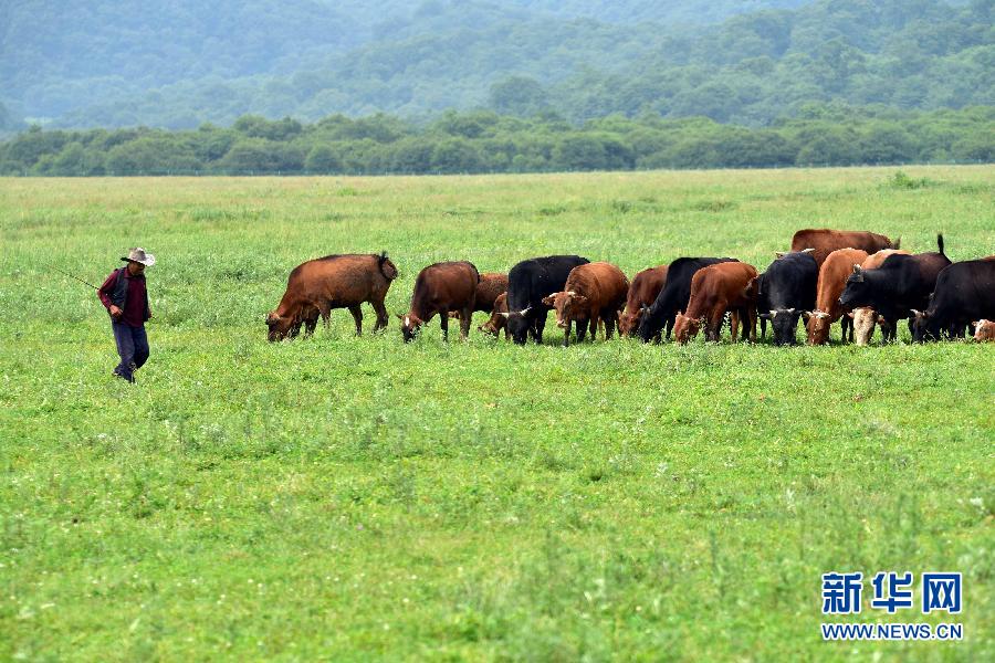 Cows eat grass in the wetland area, July 13, 2015. (Xinhua/Du Huaju)