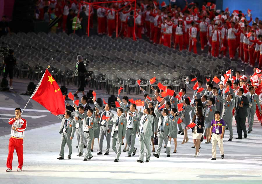 The Chinese delegation enters the arena during the opening ceremony, July 3, 2015. [Photo/Xinhua]