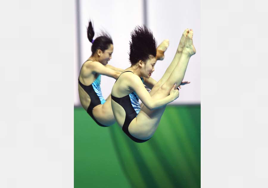 Wang Han, front, and Wang Yin compete in women's 10-meter synchronized diving, July 6, 2015. They won the bronze medal by finishing third. [Photo/Xinhua]