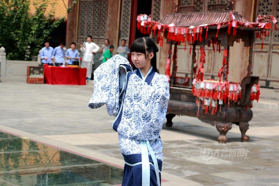 | High school students in Hanfu clothing perform in a talent show in Confucian Temple on July 12, 2015 in Jinan, Shandong province. The activity was held by Shandong Experimental High School. (iqilu.com/Bai Shaoguang) |