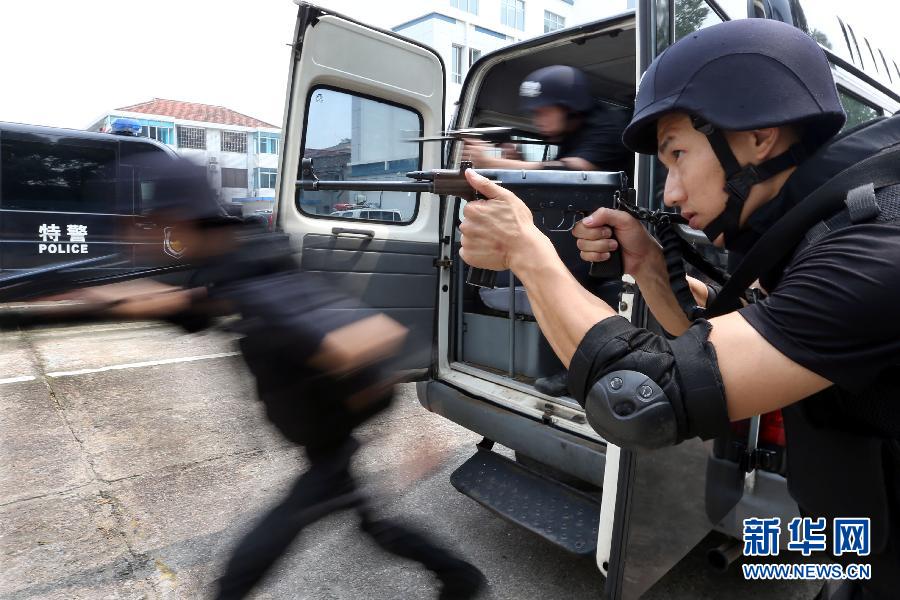 The SWAT team of Fengxian District Branch, Shanghai Municipal Public Security Bureau trains on July 14, 2015. (Xinhua/Fan Jun)
