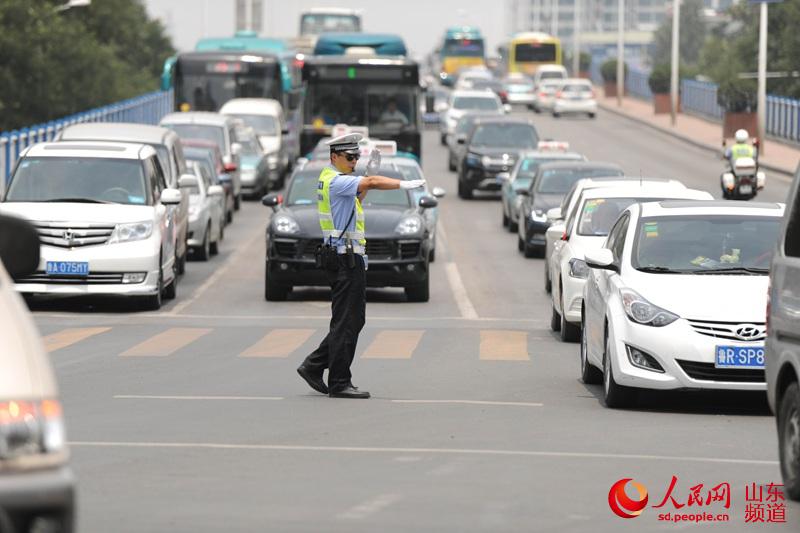 A traffic policeman holds fast to his position in the hot summer day on July 13, 2015 in Jinan, Shandong Province.