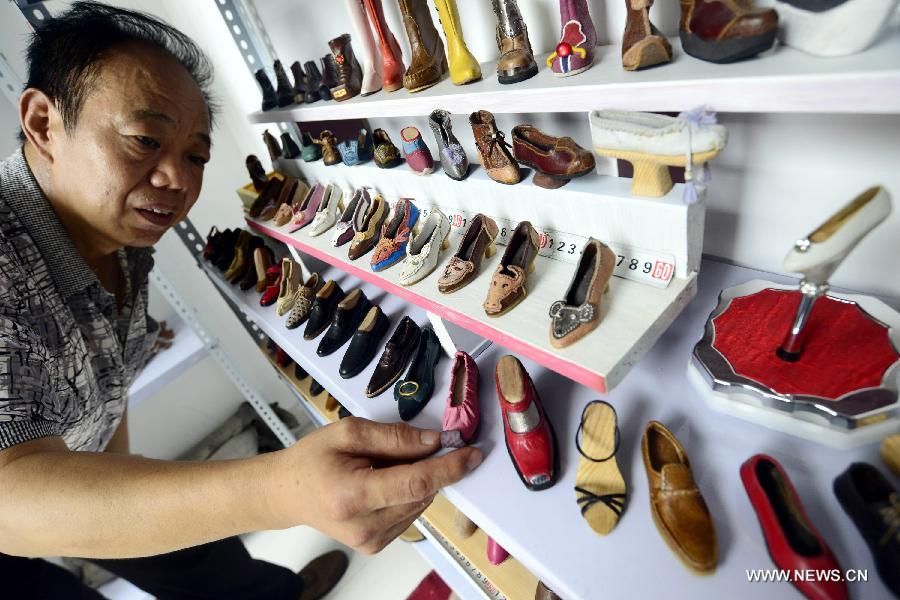 Peng Shizeng, a 55-year-old shoe designer, works on a mini shoe at a cultural and creative park in Jinan, capital of east China's Shandong Province, July 16, 2015. Peng started making the mini shoes since 2013, aiming at to attract more attention on this art. (Xinhua/Zhao Xiaoming)