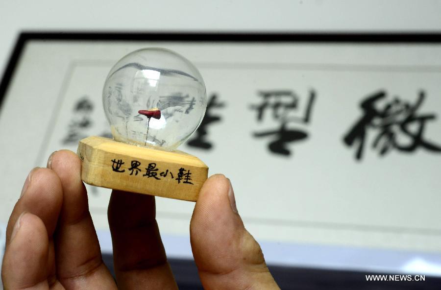 | Peng Shizeng, a 55-year-old shoe designer, shows a mini shoe at a cultural and creative park in Jinan, capital of east China's Shandong Province, July 16, 2015. Peng started making mini shoes since 2013, aiming at to attract more attention on this art. (Xinhua/Zhao Xiaoming) |