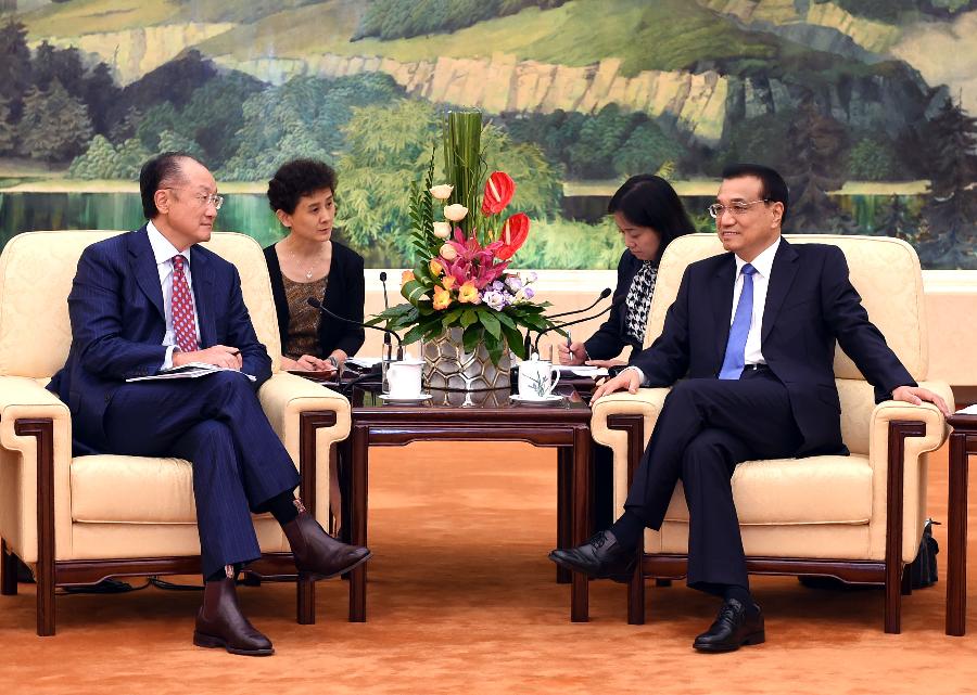 Chinese Premier Li Keqiang (R) meets with World Bank President Jim Yong Kim at the Great Hall of the People in Beijing, China, July 16, 2015. (Xinhua/Rao Aimin)