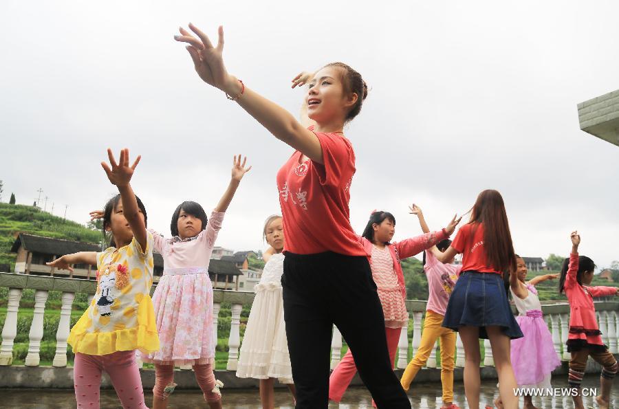 Volunteers from University of South China teach left-behind children dance in Qunshan village elementary school, township of Gutang, Lianyuan city, east China's Hunan Province, July 16, 2015. (Xinhua/Cao Zhengping)