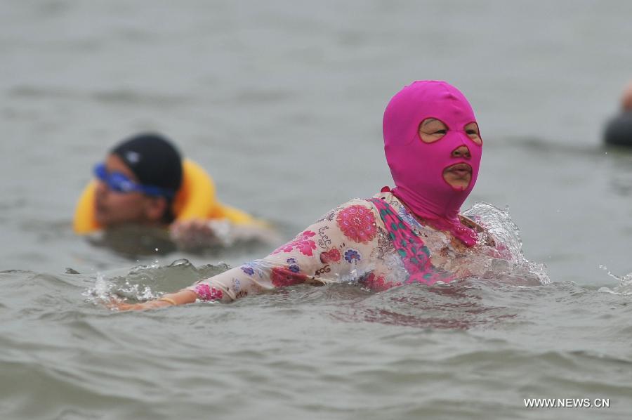 A woman wearing facekini swims in the sea in Qingdao, east China's Shandong Province, July 16, 2015. Facekini is a mask designed for swimmers to protect their heads and faces. (Xinhua/Wang Haibin)