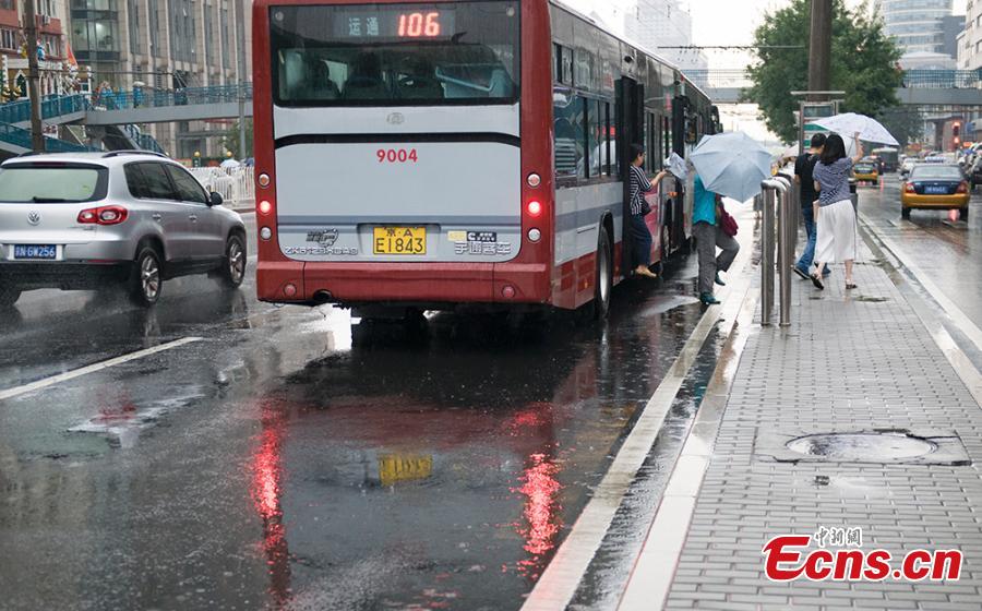 Beijing sees more rainfalls on Friday, July 17, 2015, as local weather bureau issues a yellow alert for rainstorm and a blue alert for thunder and lightning. (Photo: China News Service/Li Qing)