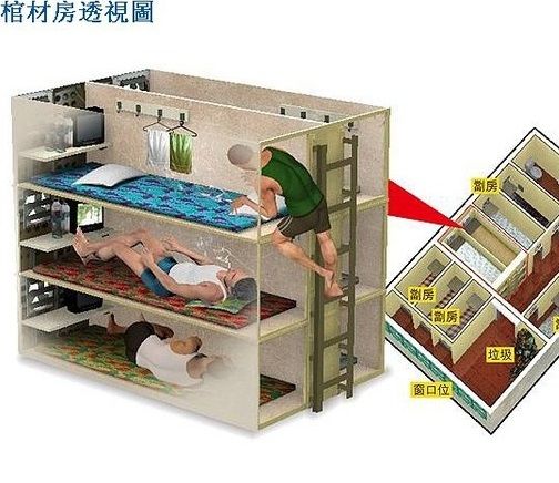 They both live in a extremely crowded studio where they share with 22 other roomates. The Studio's acutal living space is only about 53.7 square meters (about 578 square feet) but was devided into 24 separate compartments by wooden board. Each compartment is only enough to put a bed inside but its monthly rent is over 2,000 Hk dollars ($333), It is comoonly known in Kong Hong as "coffin homes" where residents are mostly low come earners.