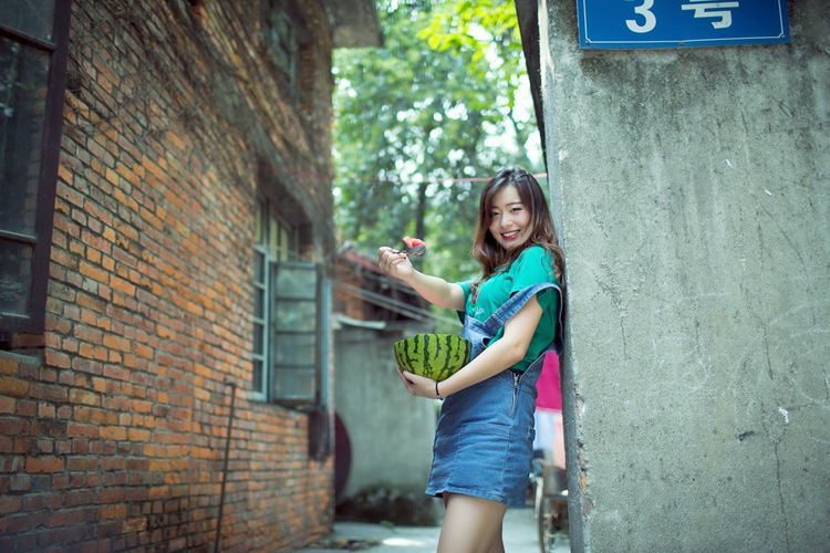 Photos of a college student posed with watermelons go popular online.(Photo source: scol.cn)