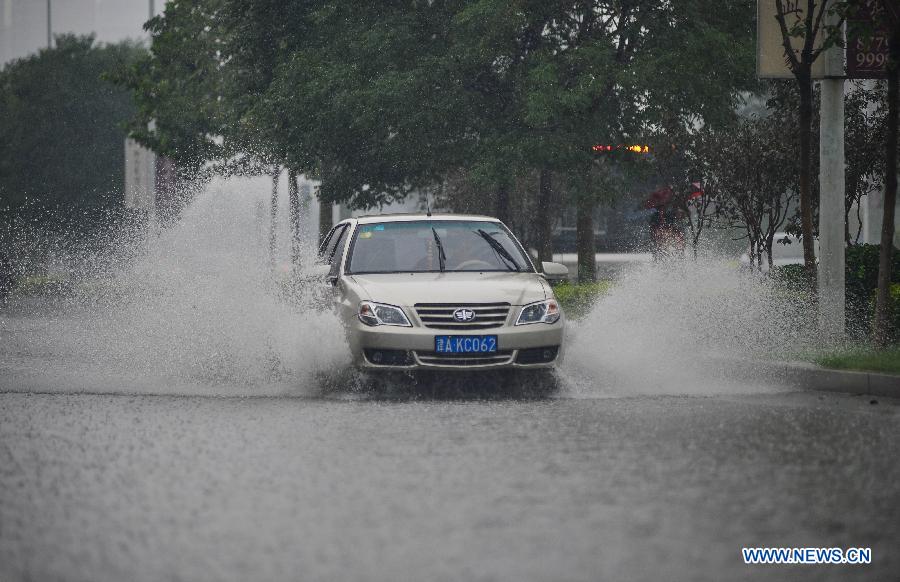 A car moves on a water-logged road in Tianjin, north China, July 19, 2015. Tianjin Weather Station issued yellow alerts for rainstorm, thunder and lightning on Sunday afternoon. (Xinhua/You Sixing)