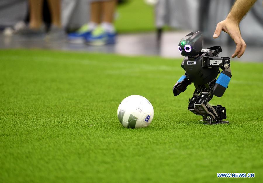 A participant adjusts his robot at the 19th RoboCup in Hefei, capital of east China's Anhui Province, July 19, 2015. More than 2,000 participants from 47 countries and regions took part in the major and junior teams competitions. (Xinhua/Liu Junxi)