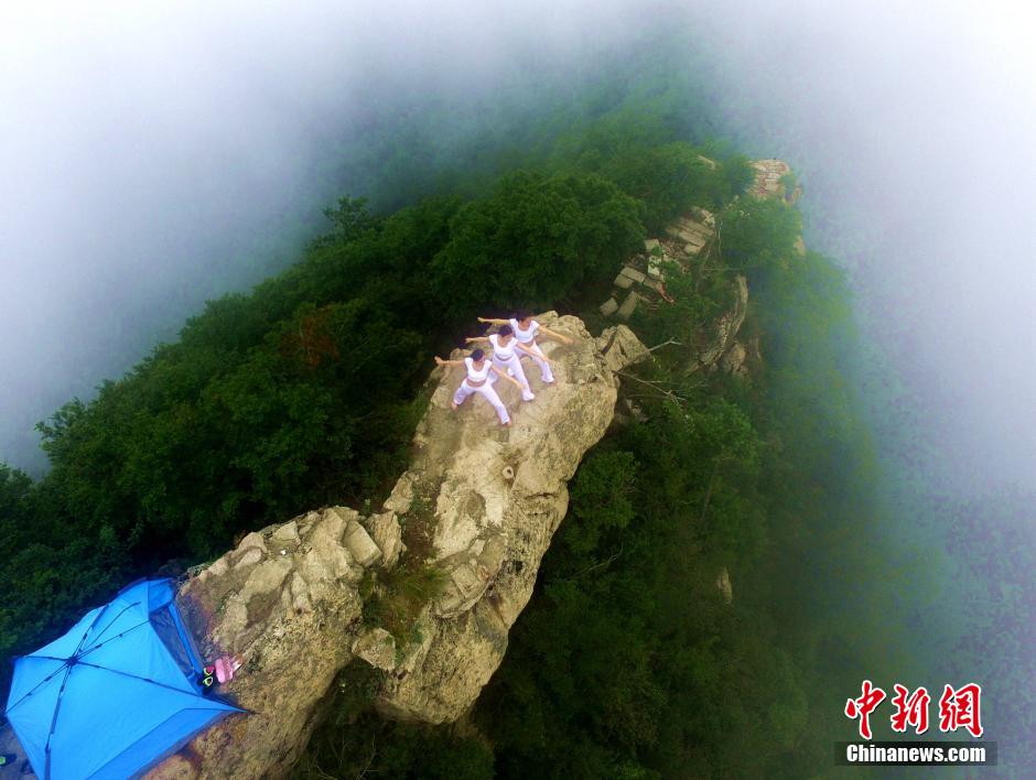 In this photo taken on July 18, girls practice yoga on a cliff over 2,000 meters high at the Funiu Mountain, central China's Henan province. (CNS Photo)