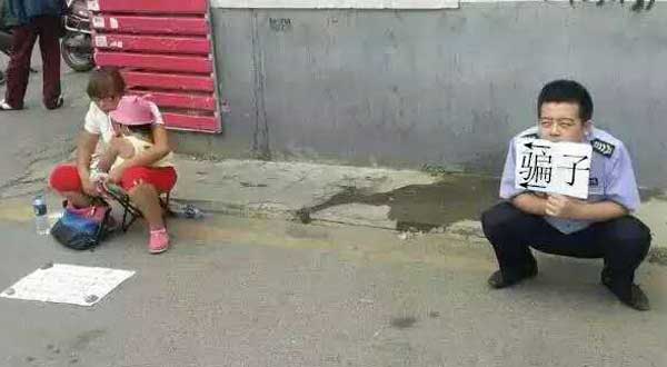Recently a security guard outside a hospital in Shenyang held a paperboard on which fraud (騙子in Chinese) and a arrow are written, in order to tell others that woman five meter away is a fraud.