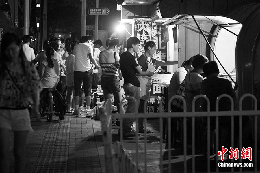 Street stands of malatang and teppanyaki besides a vegetable market. People come here some for dinner, some for drinking to kill time.