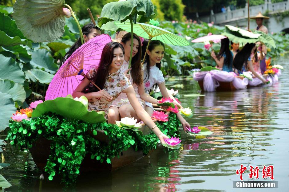| On July 19, top 10 candidates in cheongsam for 2015 Zhujiang image ambassador row boats in a lotus pond and seem like China’s “lotus fairy”. (CNS/Cui Yukun) |