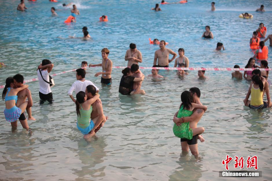 | An interesting kiss contest is held in a water world in Nanning, south China’s Guangxi province on July 18, 2015. The male contestant held his partner up and kissed her in the water and the couple who held on the longest time would win. (CNS/Wang Gang) |