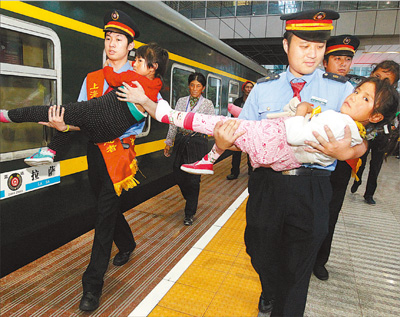 After receiving free treatment in Shanghai, a group of Tibetan children were ready to take the train No. Z164 home to Lhasa. Passenger transportation service of Shanghai Railway Brueau provided full-time ecort to the children during the trip. Toys and special nutritious meals were also provided. (Xinhua/Chen Fei)