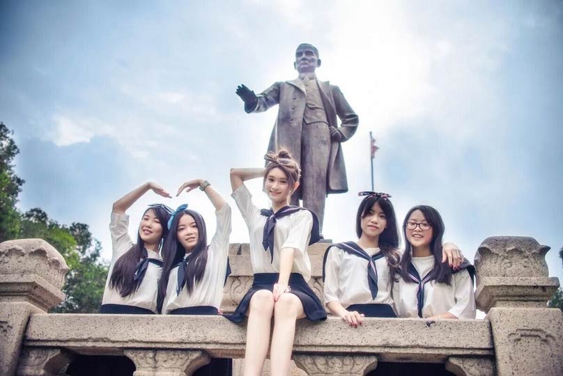 Several girls take a group of stylish graduation photos at Sun Yat-sen University in Guangzhou, capital of south China's Guangdong Province. They pose as the cast members in Tiny Times, a popular Chinese romance drama film written and directed by Guo Jingming and based on the best-selling novel of the same name also by Guo. (Photo/Xinhua)