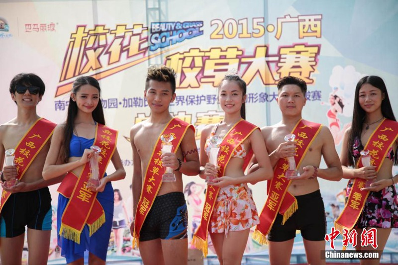 | A high school girl and a college freshman win the first campus beauty contest held in Guangxi on July 19, 2015. In addition, the top six competitors were selected as image ambassadors of Nanning Zoo to help raise public’s awareness of protecting wild animals and safeguarding our planet. (CNS/ Wang Gang) |