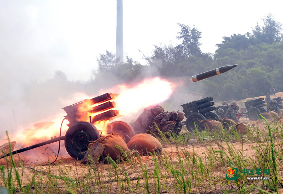 A PLA artillery regiment conducts a live fire drill on July 18, 2015, shooting at marine targets. (Photo/www.81.cn)