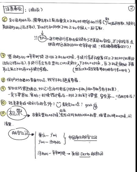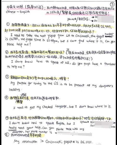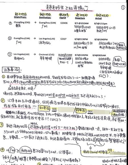 The guide has been estimated to be 2000-words long, with all the flight schedules, locations and telephone numbers marked clearly in colored ink. On its first page, the flight itinerary of Che’s parents is listed prominently in the center in both Chinese and English. They are scheduled to fly from Chongqing, Sichuan Province to Guangzhou, Guangdong Province, where they will board on a flight to Los Angeles, and then change to a flight going to their destination in Cincinnati, Ohio.