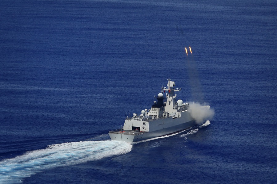 A fleet of Chinese Navy made up of missile destroyers, frigates and replenishment ships conducts live-fire drill in West Pacific on July 22, 2015. The fleet sailed across the Miyako Strait, the open sea between Japan's Miyako and Okinawa islands on July 18, for deep-sea training in the West Pacific. (Photo/ Xinhua)
