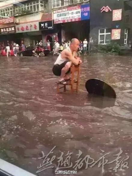 60-yr-old Li Guangzhou watched an open well lid for 3 hours to warn people away after rainstorm flooded the city of Handan in E China's Hebei Tuesday.