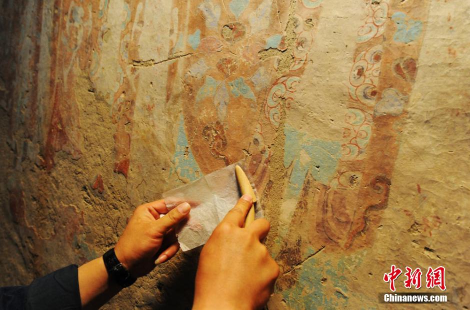 | Wearing kneecaps and cotton-padded jackets, workers of Dunhuang Academy China work eight hours a day to restore the murals in Dunhuang Mogao Grottoes in midsummer. They have rescued and protected the national treasure Mogao Grottoes with fine skills for a decade. (Photo by China News Service/ Yang Yanmin) |