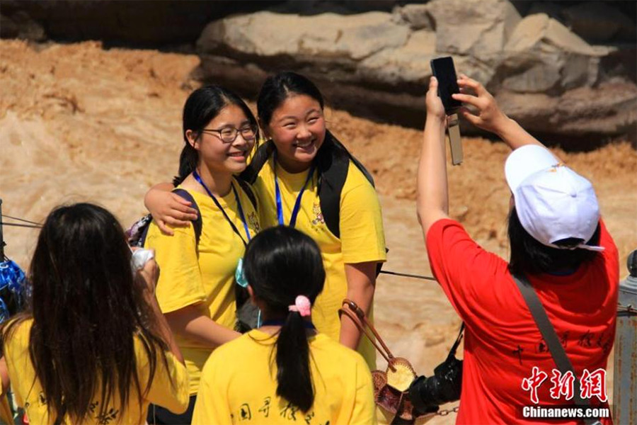 On July 22, 2015, members of 'Chinese Tour' overseas Chinese youth summer camp visit Hukou waterfall in Yanchuan county, Shaanxi province. Hukou waterfall, located at the intersection of Shanxi province and Shaanxi province, is the largest waterfall on the Yellow River and the second largest waterfall in China. A total of 200 teachers and students of Chinese ancestry from Czech, the US, Canada, the Netherlands, Finland and Switzerland are touched by the Yellow River civilization at close observance.