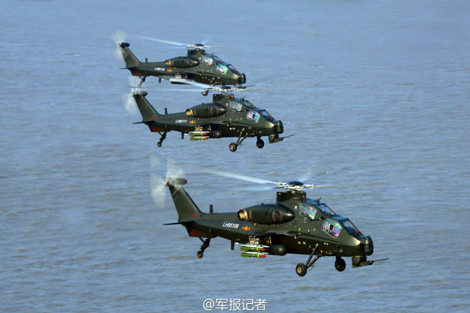 | WZ-10 helicopters carrying missiles under the Nanjing Military Area Command (MAC) of the Chinese People's Liberation Army (PLA) conduct a drill over the sea on July 21, 2015. (81.cn/Photo) |