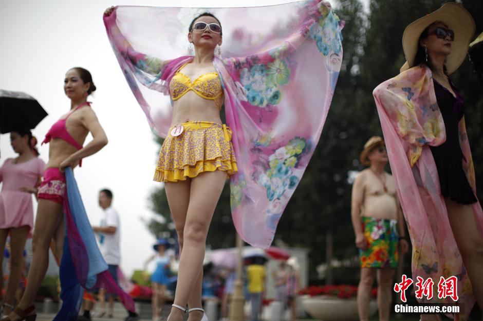 More than 100 people around 70 participate in a swimming-suits fashion show in Tianjin on July 23. Their healthy figure and confident attitude make them look like stunning super models on stage. (CNS/Tong Yu)