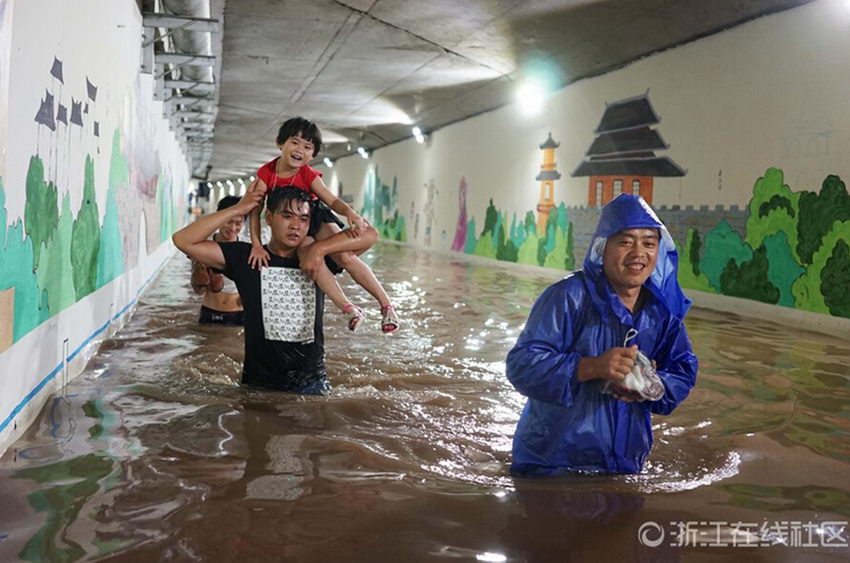 The family of Mr. Peng swim to the railway station. (Photo/ www.zjol.com.cn)