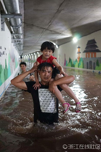 The family of Mr. Peng swim to the railway station. (Photo/ www.zjol.com.cn)